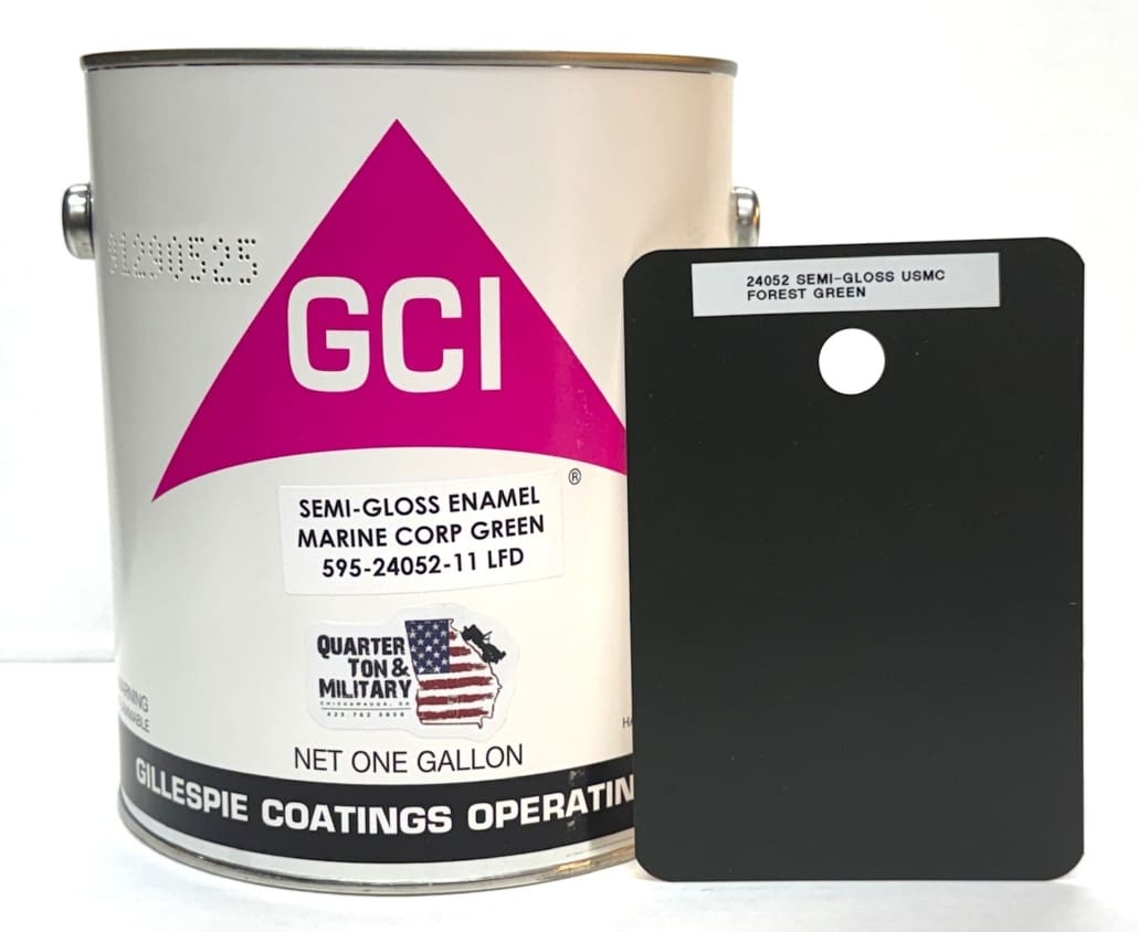 This is a very high quality and very correct gallon of 24052 Simi-Gloss USMC Forrest Green. This is correct for US Marine Corps vehicles from WWII to present. This is the correct color for the M422 and M422A1 mighty mite. This is US Made and is the super high quality Gillespie Coatings brand. This is enamel. Mixing instructions are on the back of the can. This is old school single stage paint. No hardener or any other modern additives to add. Thin with xylene and shoot. This is the correct shade of 24052 and not some off brand industrial paint that some guy has had mixed up just to sell on ebay or his web sight. This is the top of the line and the paint all the serious collectors and the US Military Museum systems use. Just ask any of the serious collectors or military vehicle restorers about the Gillespie Brand. Ok, I tried to take a picture of our sample chip and that is really the best I can do to show you the color. We do combine shipping. . Sorry Over seas buyers. This can not and will not be shipped overseas by us. This can only be shipped to the lower 48 states. Remember this is old school single stage enamel. This does not need hardener or any additives. If you start adding things you will loose the flat quality of the paint. This will need to be mixed thoroughly and or shaken up before each use. Failure to do so will cause the paint to have a sheen. I can get a complete jeep frame axles and all and about half the tub with one gallon depending on how many coats I use. Remember everyone paints differently so there is no real formula on how exact your coverage will be with a single gallon. I personally use two gallons and 12 spray cans for a jeep restoration and will have a little left over. Paint Shipping Rules: Gallons are shipped in singles, doubles, and cases of four. They can not be combined with any other items due to HAZMAT shipping rules. They will only be shipped FedEx Ground or Home delivery.