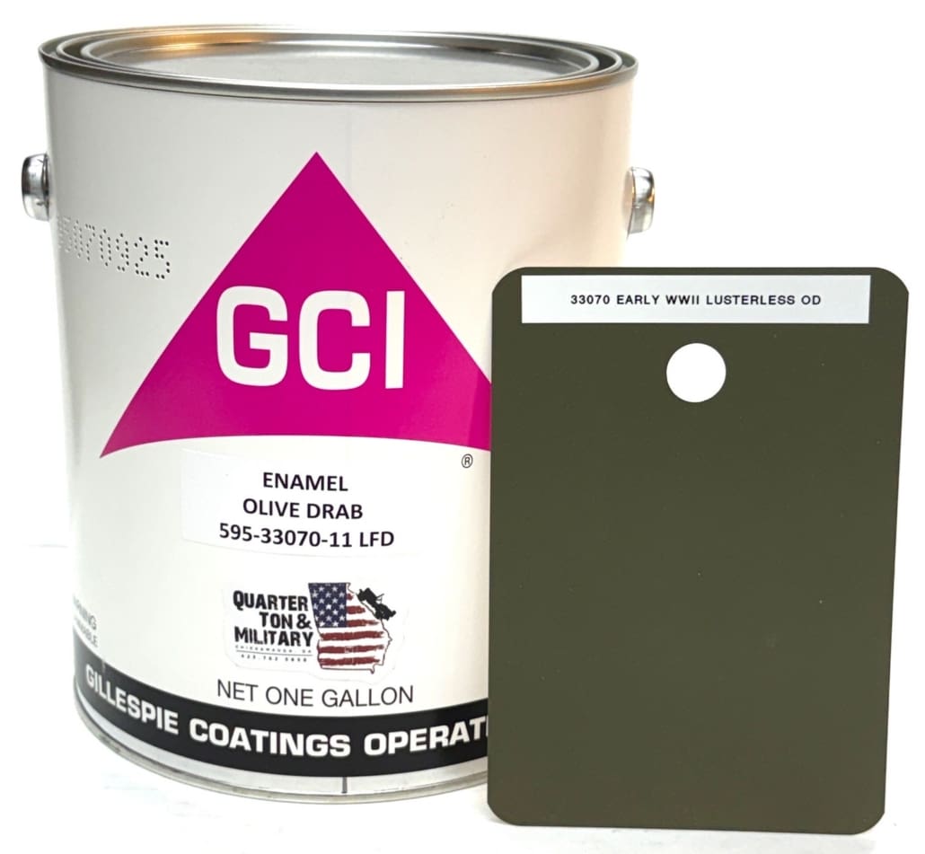 This is a very high quality and very correct gallon of 33070 Early WWII Flat Olive Drab paint. This is US Made and is the super high quality Gillespie Coatings brand. This is enamel. This is the correct shade of 33070 and not some off brand industrial paint that some guy has had mixed up just to sell on ebay or his web sight. This is the top of the line and the paint all the serious collectors and the US Military Museum systems use. Just ask any of the serious collectors or military vehicle restorers about the Gillespie Brand. Ok, I tried to take a picture of our sample chip and that is really the best I can do to show you the color. We do combine shipping. QTM Parts. Sorry Over seas buyers. This can not and will not be shipped overseas by us. Shipping to the lower 48 states only. Remember this is old school single stage enamel. This does not need hardener or any additives. If you start adding things you will loose the flat quality of the paint. This will need to be mixed thoroughly and or shaken up before each use. Failure to do so will cause the paint to have a sheen. I can get a complete jeep frame axles and all and about half the tub with one gallon depending on how many coats I use. Remember everyone paints differently so there is no real formula on how exact your coverage will be with a single gallon. I personally use two gallons and 12 spray cans for a jeep restoration and will have a little left over. Paint Shipping Rules: Gallons are shipped in singles, doubles, and cases of four. They can not be combined with any other items due to HAZMAT shipping rules. They will only be shipped FedEx Ground or Home delivery.