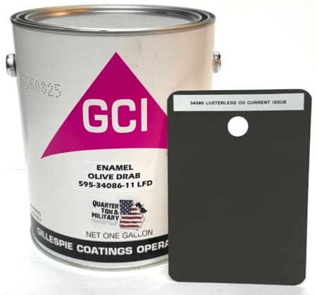 This is a very high quality and very correct gallon of 34086 Flat olive drab paint. This is the current issue olive drab military paint. This is used on USAF vehicles, ground equipment, some CUCV trucks. This is US Made and is the super high quality Gillespie Coatings brand. This is enamel. This is enamel. Mixing instructions are on the back of the can. This is old school single stage paint. No hardener or any other modern additives to add. Thin with xylene and shoot. This is the correct shade of 34086 and not some off brand industrial paint that some guy has had mixed up just to sell on ebay or his web sight. This is the top of the line and the paint all the serious collectors and the US Military Museum systems use. Just ask any of the serious collectors or military vehicle restorers about the Gillespie Brand. Ok, I tried to take a picture of our sample chip and that is really the best I can do to show you the color. Sorry Over seas buyers. This can not and will not be shipped overseas by us. This can only be shipped to the lower 48 states. á Remember this is old school single stage enamel. This does not need hardener or any additives. If you start adding things you will loose the flat quality of the paint. This will need to be mixed thoroughly and or shaken up before each use. Failure to do so will cause the paint to have a sheen. I can get a complete jeep frame axles and all and about half the tub with one gallon depending on how many coats I use. Remember everyone paints differently so there is no real formula on how exact your coverage will be with a single gallon. I personally use two gallons and 12 spray cans for a jeep restoration and will have a little left over. á Paint Shipping Rules: Gallons are shipped in singles, doubles, and cases of four. They can not be combined with any other items due to HAZMAT shipping rules. They will only be shipped FedEx Ground or Home delivery.