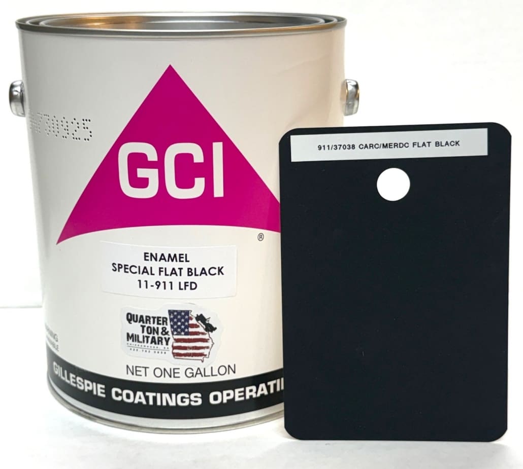 This is a very high quality and very correct gallon of 911 Flat Camo Black paint. This is that special flat black used with the three and four color Camo patterns. This is a lot richer black than the stuff you get at Wal-Mart. This is US Made and is the super high quality Gillespie Coatings brand. This is oil based enamel. This is a CARC substitute because original CARC is very dangerous to use. DO NOT ADD ANYTHING TO THIS!!!!!!! NO hardener needed!!! Thin to spray only with xylene. This is the correct shade of 911 and not some off brand industrial paint that some guy has had mixed up just to sell on eBay or his web sight. This is the top of the line and the paint all the serious collectors and the US Military Museum systems use. Just ask any of the serious collectors or military vehicle restorers about the Gillespie Brand. Ok, I tried to take a picture of our sample chip and that is really the best I can do to show you the color. We do combine shipping. QTM Parts.